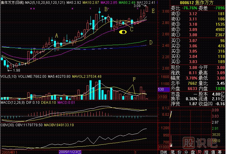 能量分解圖235-1(圖235-1)中VOLJC的成交量柱體圖顯示,泛海建設(shè)從近半年的日成交量分布情況,你可以感覺(jué)到A、B、C、D四個(gè)區(qū)間成交量大,E成...