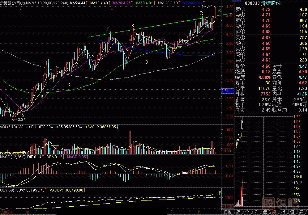 六線四托將日價(jià)格平均線參數(shù)設(shè)為:5、10、20、60、120和240日,出現(xiàn)了5日價(jià)格平均線、10日價(jià)格平均線、20日價(jià)格平均線、60日價(jià)格平均線...