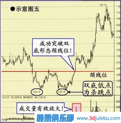我們知道,股市里常把頸線比作股市的生命線,可見頸線的重要性。一般來說:當股價站穩(wěn)在頸線上方時,可以看多做多;當股價有效突破頸線時,投資者應該看空做空。其實雙底、雙頂,頭肩底、頭肩頂,多重底、多重頂?shù)榷寄墚嬌项i線,并用其判斷阻力、支撐位的一種方法(參見下圖五)。