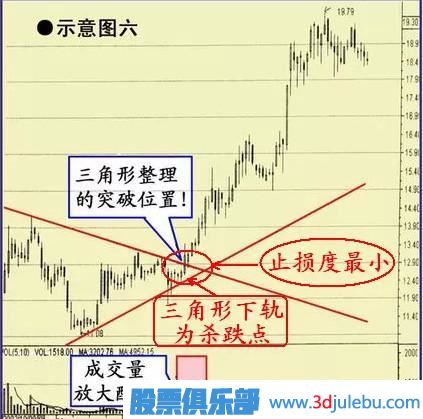 股票上漲后不久就出現(xiàn)了收斂三角形整理的走勢,構成了追漲的買入位置(參見下圖六)。