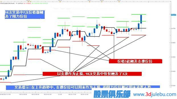 阻力位置似乎對(duì)於價(jià)格有著明顯的牽引作用。我們可以運(yùn)用支撐作為止損,利用阻力作為盈利目標(biāo),而且如果你并不急於平倉(cāng),想繼續(xù)順勢(shì)持倉(cāng),那么你也可以隨著指標(biāo)逐漸上移你的止損。上圖中美元/瑞郎的交易也表現(xiàn)了該交易系統(tǒng)的高勝率,10次交易中僅有3次因?yàn)橛|及止損而失敗。看完文章,我想大伙兒應(yīng)該明白短線交易技巧之軸心交易法(圖解)了吧!中短線炒股技巧早已在上述文章為大伙兒開(kāi)展了幾番解讀,堅(jiān)信諸位在看了以后應(yīng)該可以了解要留意的某些關(guān)鍵事宜哦。