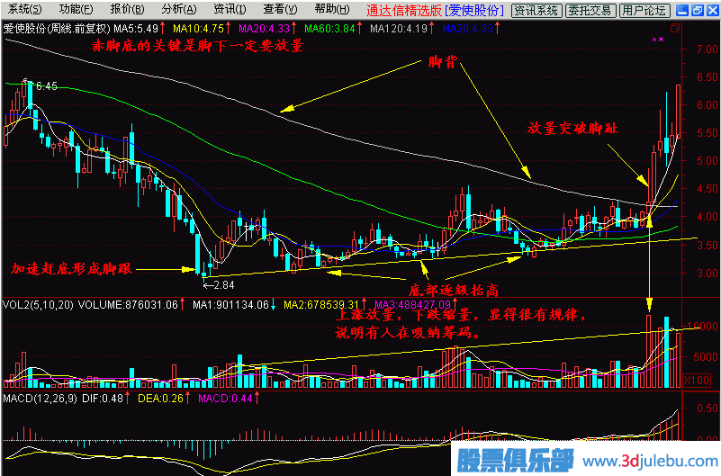 赤腳底的關(guān)鍵是腳下一定要放量,而且最好是底部抬高,這樣才是健康的腳,底部都不抬高的,那就不是赤腳底了,可能演變?yōu)閳A底等其它形態(tài)了。