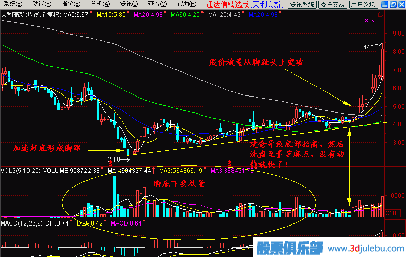 量是關(guān)鍵點,量縮放要有規(guī)律,除了腳底要有量,還有突破腳趾頭時也要放量,還有一個關(guān)鍵點就是股價盤整到腳趾頭那個位置時必須各種中短期均線幾乎收斂在一起,那才是最有力的腳趾頭,只要有量的配