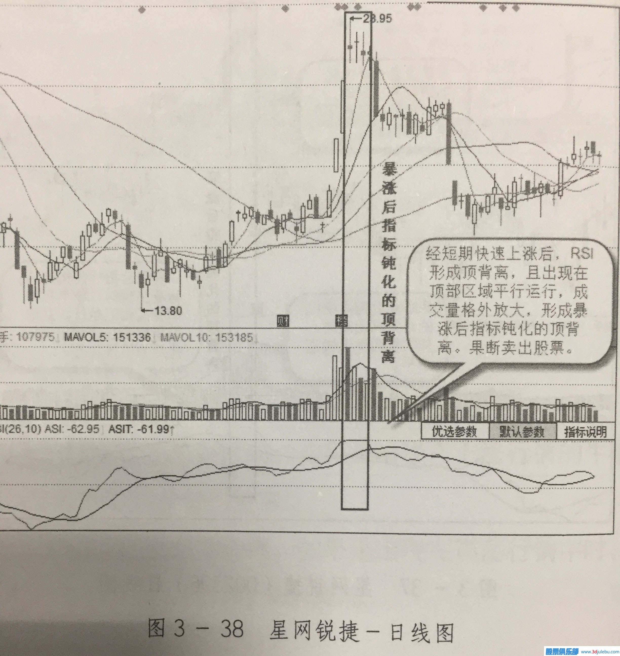 (2)暴漲后指標鈍化的頂背離如果是出現(xiàn)在牛市中時,是在牛市初期,股價快速告別底部區(qū)域時,此時股價快速上漲后會出現(xiàn)高位調整,因此也短線操盤的賣點。