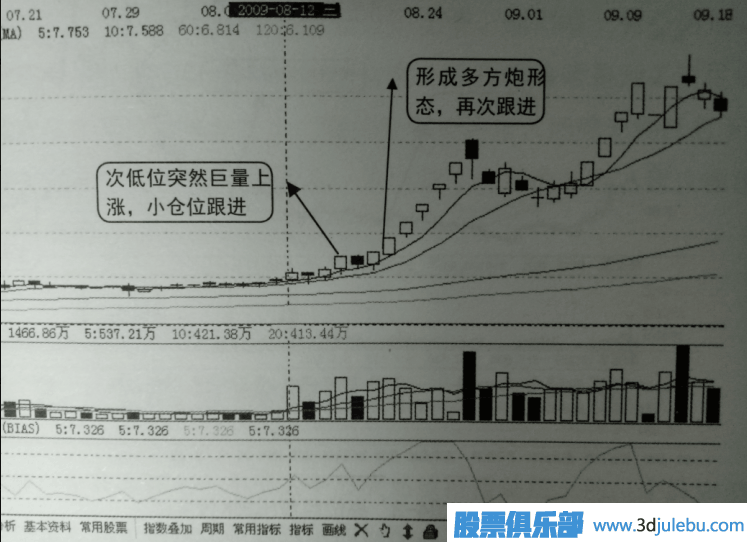 圖中顯示8月12日后的第二個(gè)交易日k線便形成多方炮格局(兩陽(yáng)夾一陰),再次跟進(jìn)是最明智的選擇,結(jié)果該股隨即出現(xiàn)連續(xù)漲停,十幾個(gè)交易日便實(shí)現(xiàn)股價(jià)翻番,由此可見次低位突然出現(xiàn)巨量拉升一定要引起足夠的重視,其中可能蘊(yùn)含著巨大的機(jī)會(huì)。