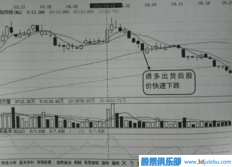 上面是莊家坐莊的整個(gè)過程,希望讀者能夠認(rèn)真體會(huì),深刻認(rèn)識(shí)量能在分析莊家行為中的重要性。如圖4所示是該股頂部區(qū)域的放大圖,圖中清晰可見該股在2011年4月18日當(dāng)天突然出現(xiàn)巨量拉升,股價(jià)似乎有二次走高的趨勢(shì),第二天量能更是放大,出現(xiàn)明顯沖高回落走勢(shì),隨后股價(jià)便出現(xiàn)連續(xù)大跌,該股從此進(jìn)入到散戶行情,股價(jià)一去不復(fù)返。