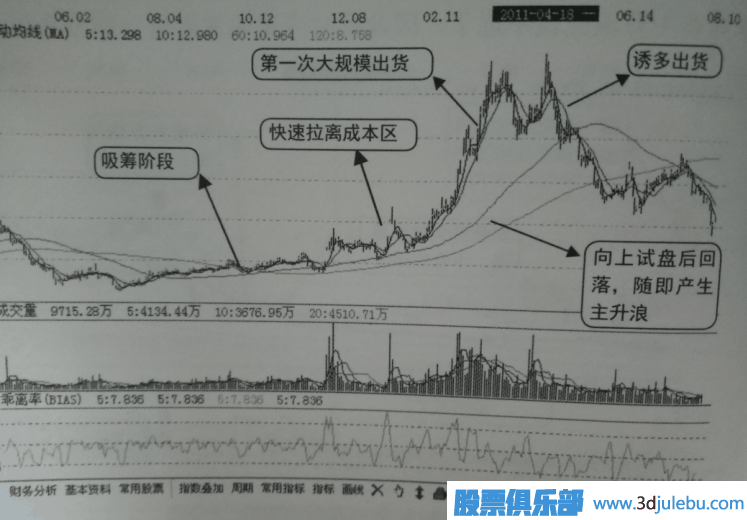 如圖3所示是海欣股份(600851) 的整體K線圖,從圖中可以看出,該股自底部起股價(jià)緩慢爬升,量能溫和放大,此階段為主力吸籌階段,隨后經(jīng)歷短暫的震倉(cāng)過程后快速拉離成本區(qū),拉離成本區(qū)后在次高位進(jìn)行橫盤震蕩并發(fā)生了一次主力試盤動(dòng)作,試盤結(jié)束后股價(jià)自由回落至前期橫盤震蕩區(qū)域,隨即產(chǎn)生主升浪,股價(jià)大幅上漲,進(jìn)入翻倍區(qū)域后量能明顯放大,主力進(jìn)行第一次大規(guī)模出貨,隨后股價(jià)明顯回落,為了將手中剩下的籌碼出貨殆盡,主力便設(shè)計(jì)了第二次拉高誘多出貨,也就是圖中所示的2011年4月18日位置,隨后股價(jià)便大幅下跌,從此一去不復(fù)返,主力出貨宣告成功,炒作告一段落。