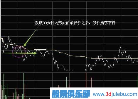 每日開盤后主力對股價(jià)打壓或造成急跌的現(xiàn)象通常會(huì)在10分鐘內(nèi)完成,最多不超過30分鐘,所以開盤打壓股價(jià)絕非散戶行為。30分鐘內(nèi)在分時(shí)圖上形成的最近價(jià)非常具有參考價(jià)值,多數(shù)情況下主力要堅(jiān)守此價(jià)格,一旦跌破此價(jià)格就需要引起警惕,在主力都不護(hù)盤(不保護(hù)最低價(jià))的情況下,股價(jià)難有表現(xiàn)。任何股票在開盤30分鐘內(nèi),只要不跌破最低價(jià),都無需恐慌和害怕。一旦出現(xiàn)破位跡象,以短線操作為主的投資者就應(yīng)立刻出局觀望。如圖: