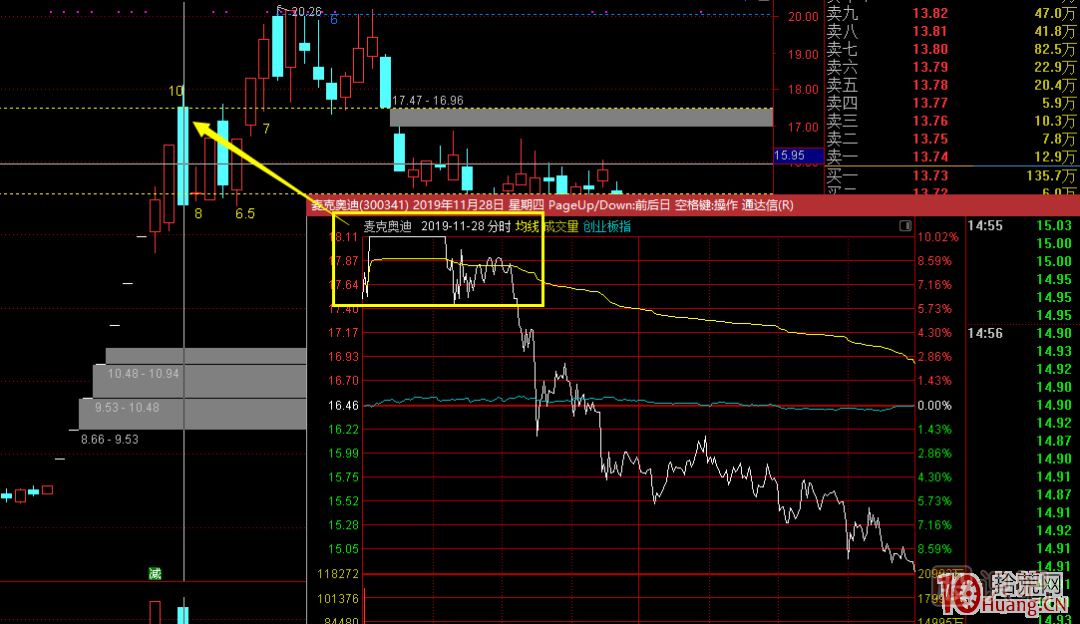 這個黃框內(nèi)的籌碼,在第三天開盤就出現(xiàn)了砸盤,這里高度也就上不去了,反包戛然而止。