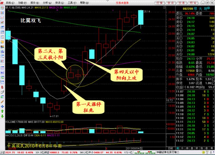 一只股票以漲停為前兆,第二天股價不補缺口卻收出小陽,第三天再度收出并排的一根小陽,則第四天或第五天往往會以中