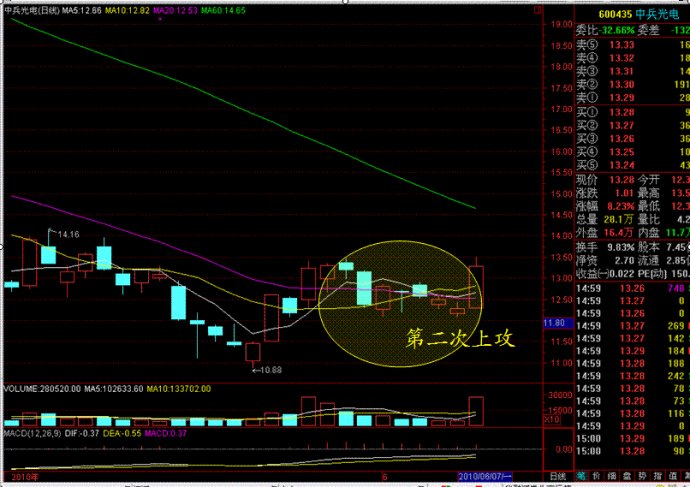 是指股價低位企穩(wěn),依托5日均線,以連續(xù)小陽線緩步攀升,其成交量保持在相對溫和的狀態(tài),會放出間歇量。特別是在盤勢回調(diào)時仍可保持同一節(jié)奏,就像螞蟻雄兵在不斷前進一樣。但這時候不是最佳的買點,而是在出現(xiàn)回調(diào),下破5日線,在10日線附近獲得支撐并收下影陰線的時候,考慮介入。因為隨后兩天往往會以陽線向上攻擊,創(chuàng)出新高。