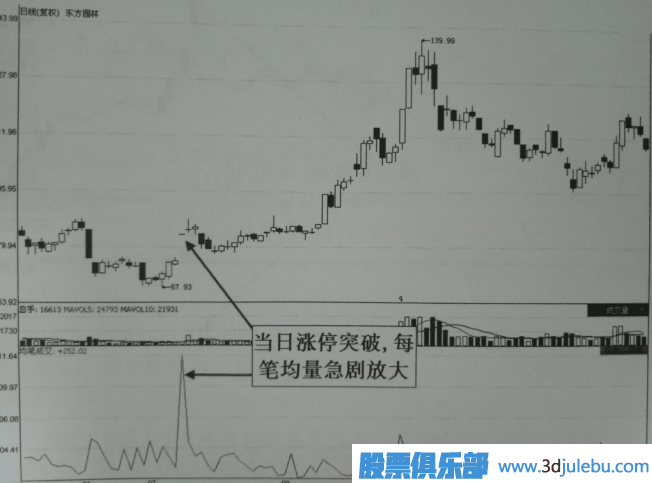 漲停突破日+每筆均量急劇放大形態(tài)是指個股在盤整之后的突破位置點出現(xiàn)了一個漲停板形態(tài),當日的每筆均量大幅度放出。