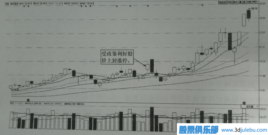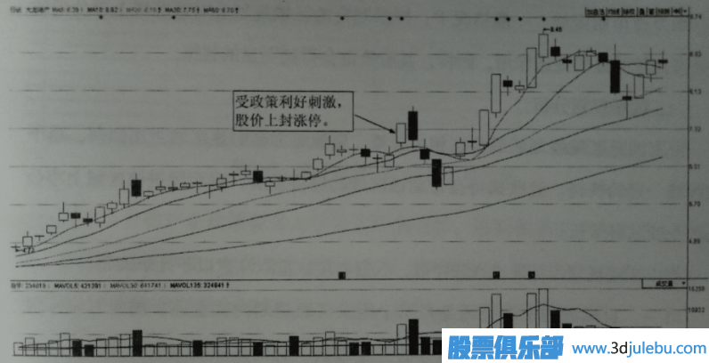 如圖1所示,在大龍地產(chǎn)(600159) 日K線圖中,該股股價前期一直處于小幅爬升的上漲趨勢中。消息面上,2015年4月30日,中央政治局會議審議通過的(京津冀協(xié)同發(fā)展規(guī)劃綱要》指出,推動京津冀協(xié)同發(fā)展是一個重大國家戰(zhàn)略,核心是有序疏解北京非首都功能。公司作為當?shù)胤康禺a(chǎn)上市公司,其股價受益政策利好出現(xiàn)漲停板。之后,其又走出了一波上漲行情。
