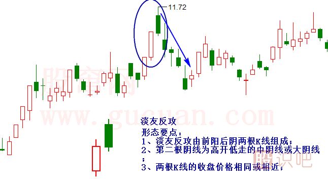 淡友反攻淡友反攻案例講解:豫光金鉛(600531)在2010年的一波上漲行情中,于11月10日收出一根大陽(yáng)線,但11日收出一個(gè)高開低走的大陰線,形成一...