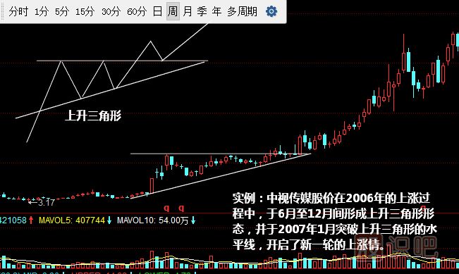 上升三角形顯示買賣雙方在該范圍內(nèi)的較量,但買方的力量在爭持中已稍占上風。賣方在其特定的股價水平不斷沽售,雖不急于出貨,但卻不看好后市,于是股價每升到理想的沽售水平便即刻沽出,這樣在同一價格的沽售形成了一條水平的供給線。