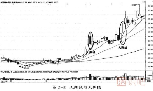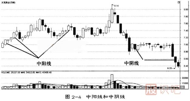 比小陽線與小陰線的實(shí)體再放大些的是中陽線與中陰線,其開盤價(jià)與收盤價(jià)的波動(dòng)范圍更大(如圖2-4)