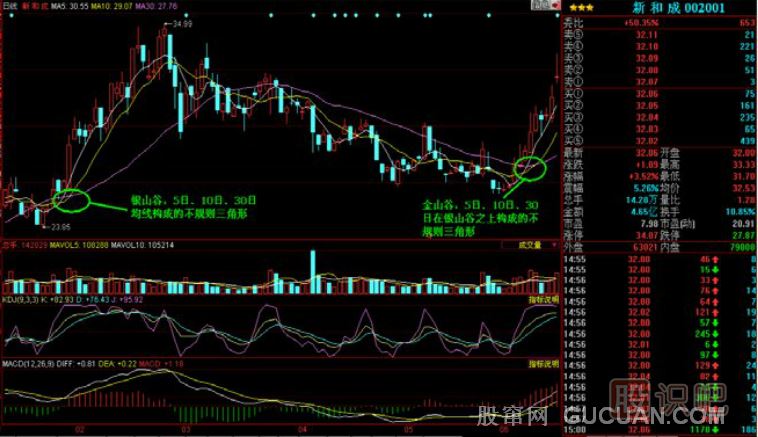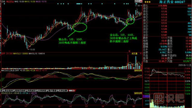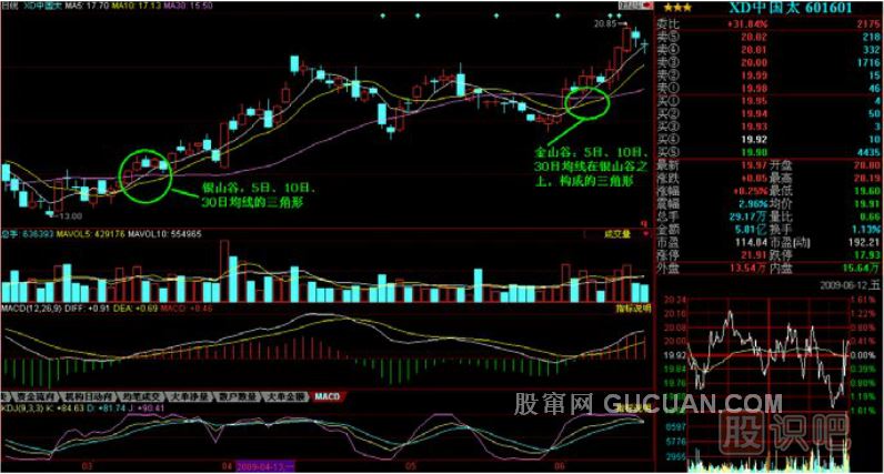銀山谷與金山谷的概念:指5日(或者短期)均線上穿10日(或者中期)均線和30日(或者長期)均線,中期均線上穿長期均線形成的一個尖頭向上的三角形,三根均線交叉形成銀山谷以后,再次交叉形成一個尖頭向上的不規(guī)則三角形,如果這個三角形所處的位置與銀山谷的位置相近或高于銀山谷,那么這個三角形叫金山谷。均線的銀山谷(金山谷)的威力等于均線復合金叉的威力,一旦形成均線的銀山谷(銀山谷)之后,個股或大盤的漲幅在通常10一2上。如下圖: