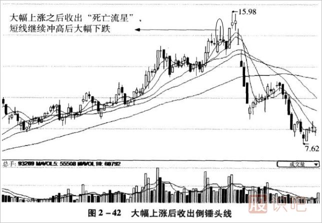 若倒錘頭線出現(xiàn)在股價(jià)大幅上漲之后,那么就要特別小心了。這跟上一節(jié)所說的錘頭線相似,上一節(jié)的錘頭線被稱為“斷頭錘”,這一節(jié)倒過來的錘頭線,書面的叫法為“射擊之星”,筆者稱它為“死亡流星”。