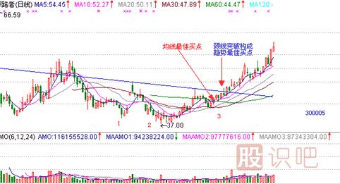 探路者(300005)同樣在今年初構(gòu)造了三川底部形態(tài),底部清晰的地量結(jié)構(gòu),明白無誤的均線最佳買點和突破頸線后的趨勢最佳買點,練多了熟了雖不能百分之百保證大賺但確實會提高你盈利的概率。