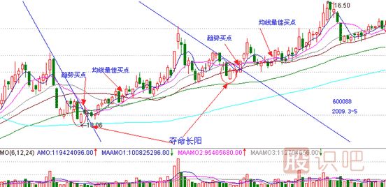 600088,中視傳媒,2009年3月10日和5月12日在波段底部都出現(xiàn)了奪命長陽,兩處同樣出現(xiàn)了趨勢買點(diǎn)和均線最佳買點(diǎn),操盤手的慣性操盤習(xí)慣告訴了我們準(zhǔn)確抄底的絕佳時(shí)機(jī)。