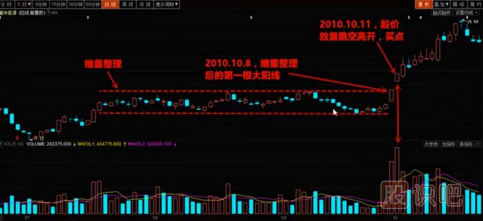 2.股價(jià)在縮量整理的過(guò)程中出現(xiàn)一根大陽(yáng)線。