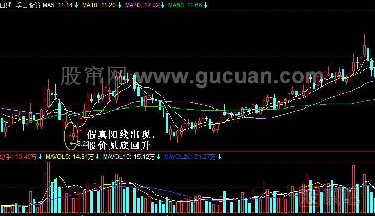 4.有假真陰線就有假真陽線,其技術(shù)含義正好與假真陰線相反。