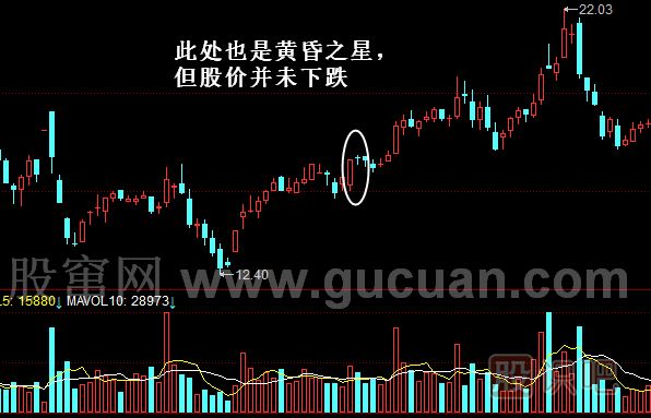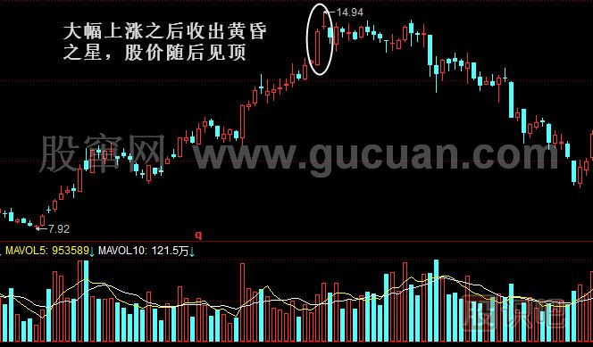 5.黃昏之星若出現(xiàn)在大幅上漲之后,見