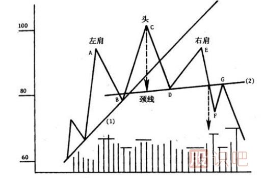 2.成交量較大的左肩(點(diǎn)A )之后是至點(diǎn)B 向下調(diào)整。