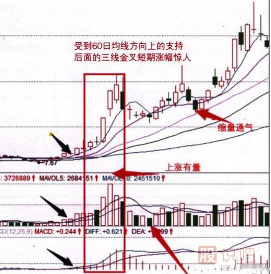 (5)5日、10日均線的方向金叉向上,此時(shí)如果60日均線也能方向向上,則助漲。