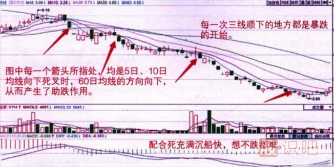 4、還有一個(gè)要注意的原則就是:三線順下時(shí)往往是暴跌的開始。