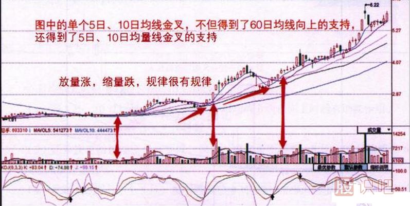 3、當(dāng)5日、10日均線黃金交叉向上時(shí),代表10日內(nèi)平均買入的人已有盈利,這樣可以吸引短線的投資者入市。如果此時(shí)60日均線在該黃金交叉之下,代表此時(shí)60日均線處買入的人各有盈利,此時(shí)可吸引中、長線的投資者入市,這樣對股價(jià)有助漲作用;反之,有助跌作用。