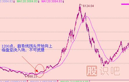 A股經(jīng)過暴跌之旅,2005年11月份,大盤趨勢線拐頭開始向上,此時(shí)大盤大約1160點(diǎn),此時(shí)投資者可以果斷入場,不要有任何猶豫。后市行情最高發(fā)展到6124點(diǎn)。