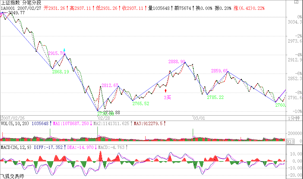 詳細(xì)說,在上面例子30分鐘的a+A+b+B+c里,A是已出現(xiàn)的,是一個(gè)30分鐘的中樞,這可以用定義嚴(yán)格判別,沒有任何含糊、預(yù)測(cè)的地方。而b段一定不可以出現(xiàn)30分鐘的中樞,也就是只能最多是5分鐘級(jí)別的。如果b段一個(gè)5分鐘級(jí)別的開始上漲已經(jīng)使得30分鐘的圖表中不可能出現(xiàn)背馳的情況,那么你就可以有足夠的時(shí)間去等待走勢(shì)的延伸,等待他形成一個(gè)5分鐘的中樞,一直到5分鐘的走勢(shì)出現(xiàn)背馳,這樣就意味著B要出現(xiàn)了,一個(gè)30分鐘的新中樞要出現(xiàn)了。是否走,這和你的資金操作有關(guān)了,如果你喜歡短線,你可以走一點(diǎn),等這個(gè)中樞的第一段出現(xiàn)后,回補(bǔ),第二段高點(diǎn)看5分鐘或1分鐘的背弛出去,第三段下來再回補(bǔ),然后就看這個(gè)中樞能否繼續(xù)向上突破走出c段。注意,c段并不是天經(jīng)地義一定要有的,就像a也不是天經(jīng)地義一定要有的。要出現(xiàn)c段,如同要出現(xiàn)b段,都必須有一個(gè)針對(duì)30分鐘的第三類買點(diǎn)出現(xiàn),這樣才會(huì)有。所以,你的操作就很簡單了,每次,5分鐘的向上離開中樞后,一旦背馳,就要出來,然后如果一個(gè)5分鐘級(jí)別的回拉不回到中樞里,