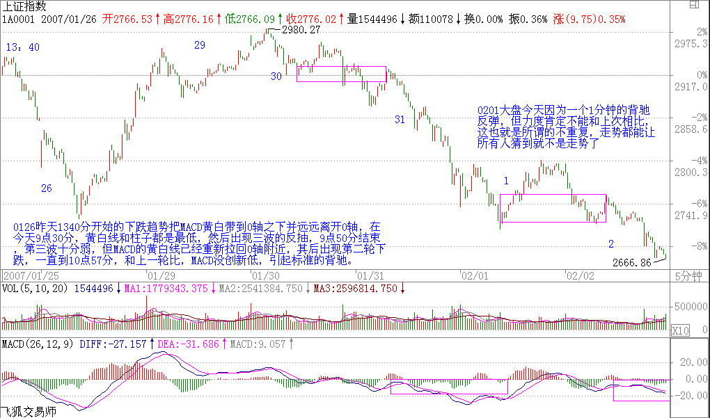 今天的走勢十分標準規(guī)范,只要對本ID的理論有一點了解的,都不難找到這個5分鐘背馳的底部。目前的事情很簡單了,5分鐘背馳,一個大的阻力就是2720,這是上次的低點,如果能上去,那周線的第一段就不會演化成下跌的趨勢(2007-02-02 15:20:44 這輪牛市的第一段都沒走完,什么叫基本走完?一個周線的調(diào)整很正常,又不是今天才說的。這個調(diào)整的級別最多就是去年5月到8月那個,8月以后是什么?),一個2720上下的周線中樞將逐步形成,否則,就有在下面形成下跌的第二個中樞的可能,這樣走勢壓力就比較大