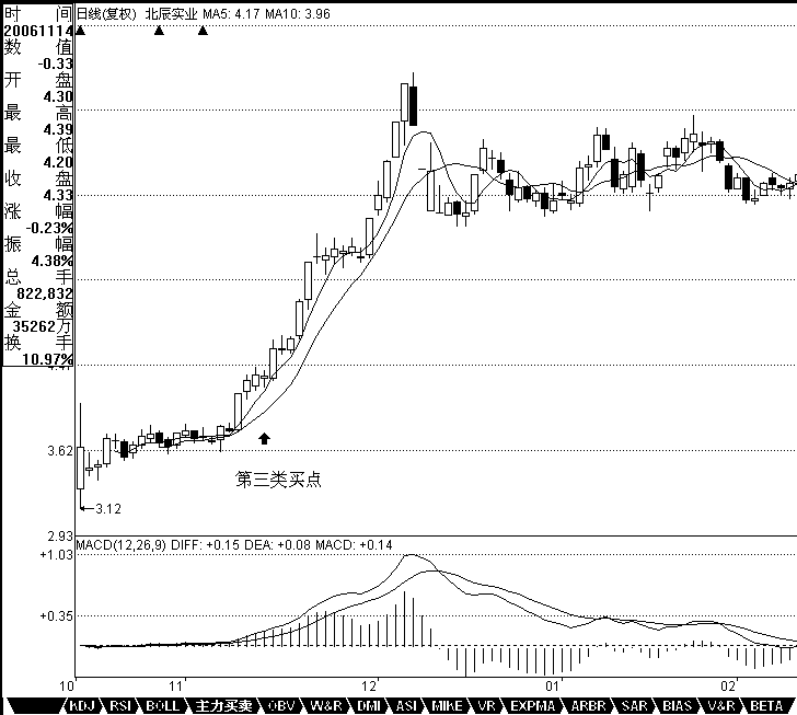 例如,工商銀行在12月14日構(gòu)成典型的日線(xiàn)級(jí)別第三類(lèi)買(mǎi)點(diǎn);北辰實(shí)業(yè)在11月14日構(gòu)成典型的日線(xiàn)級(jí)別第三類(lèi)買(mǎi)點(diǎn);000803在1月20日構(gòu)成典型的日線(xiàn)級(jí)別第三類(lèi)賣(mài)點(diǎn)。注意,第三類(lèi)買(mǎi)賣(mài)點(diǎn)比第一、二類(lèi)要后知后覺(jué),但如果抓得好,往往不用浪費(fèi)盤(pán)整的時(shí)間,比較適合短線(xiàn)技術(shù)較好的資金,但一定要注意,并不是任何回調(diào)回抽都是第三類(lèi)買(mǎi)賣(mài)點(diǎn),必須是第一次。而且,第三類(lèi)買(mǎi)賣(mài)點(diǎn)后,并不必然是趨勢(shì),也有進(jìn)入更大級(jí)別盤(pán)整的可能,但這種買(mǎi)賣(mài)之所以必然贏利,就是因?yàn)榧词故潜P(pán)整,也會(huì)有高點(diǎn)出現(xiàn)。操作策略很簡(jiǎn)單,一旦不能出現(xiàn)趨勢(shì)纏論的盤(pán)整解讀纏中說(shuō)禪走勢(shì)中樞級(jí)別擴(kuò)張及第三類(lèi)買(mǎi)賣(mài)點(diǎn),一定要在盤(pán)整的高點(diǎn)出掉,這和第一、二類(lèi)買(mǎi)點(diǎn)的策略是一樣的。