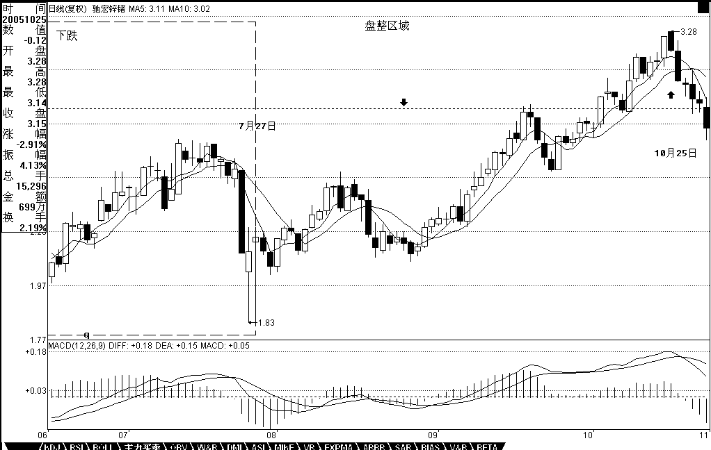 其后的上漲,對600497馳宏鋅鍺, 2005年7月27日到10月25日,明確地出現(xiàn)在日線上的上漲走勢(為什么?因?yàn)樵谌站€上明確地看到兩個(gè)CZSC走勢中樞)。而580991從2006年10月23日到12月13日,只構(gòu)成日線上的盤整走勢(為什么?因?yàn)樵谌站€上明確地看到一個(gè)CZSC走勢中樞)。(備注:580091配圖見前面15課后1219的回復(fù))
