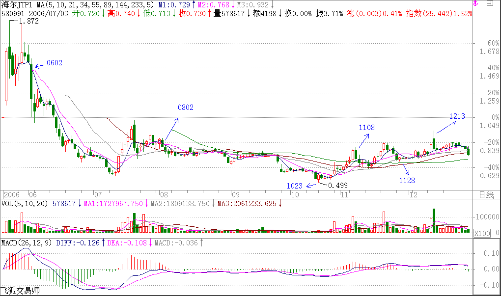 純粹的兩條均線的K線圖,就足以應(yīng)付最復(fù)雜的市場走勢了。當(dāng)然,如果沒有這樣的看圖能力,可以參照一下技術(shù)指標(biāo),例如MACD等,關(guān)于各技術(shù)指標(biāo)的應(yīng)用,以后會陸續(xù)說到。