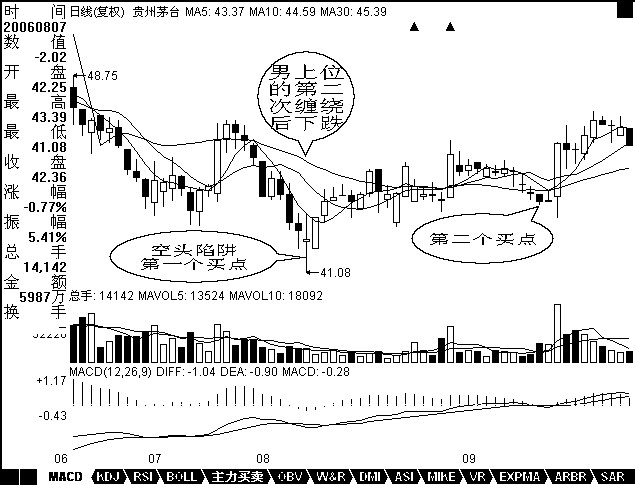 8月7日,男上位的第二次纏繞后下跌,但成交量等都明顯出現(xiàn)背弛,構(gòu)成小的空頭陷阱,成為第一個買點(diǎn)在41元附近。