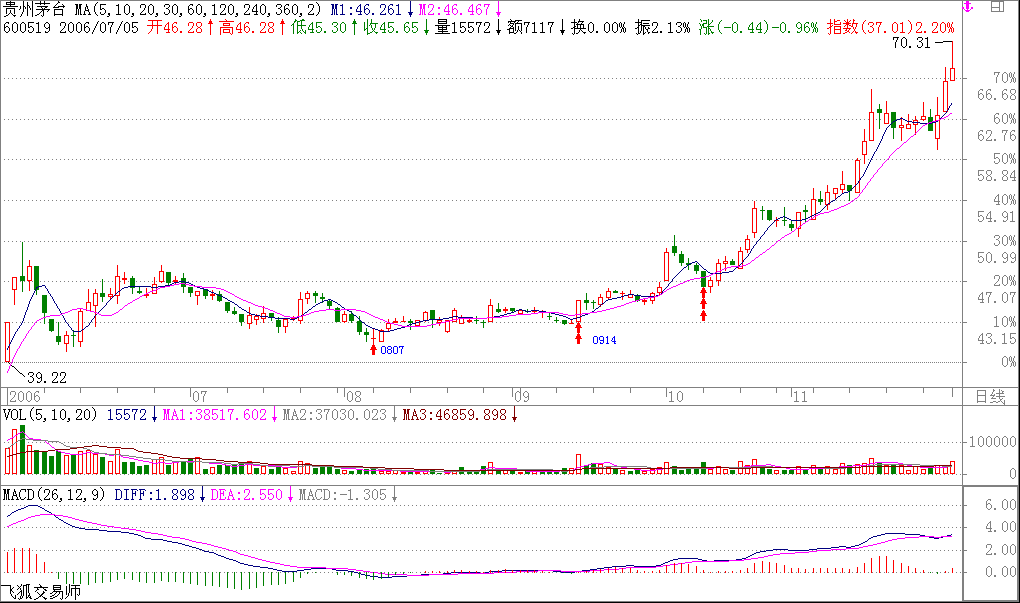 對于喜歡用日線的,用茅臺為例子給一個分析,5日和10日。